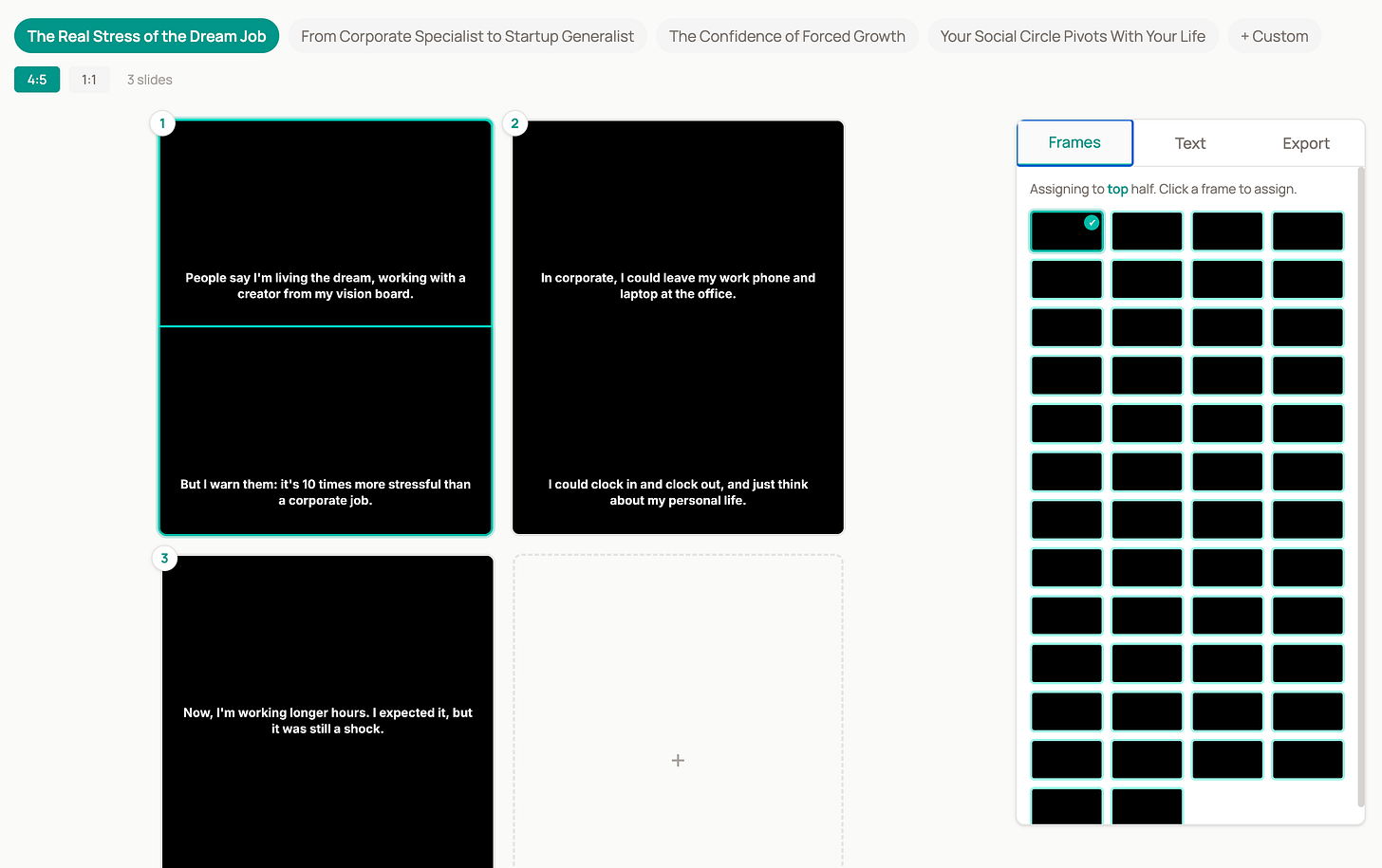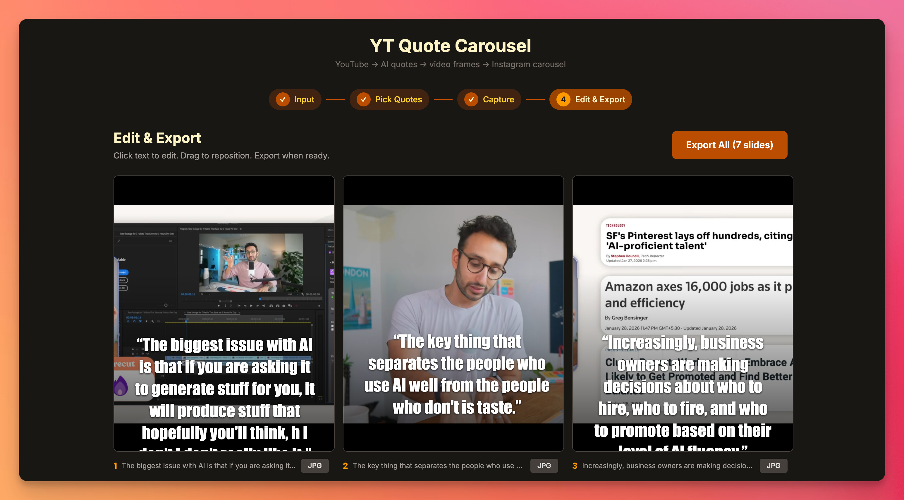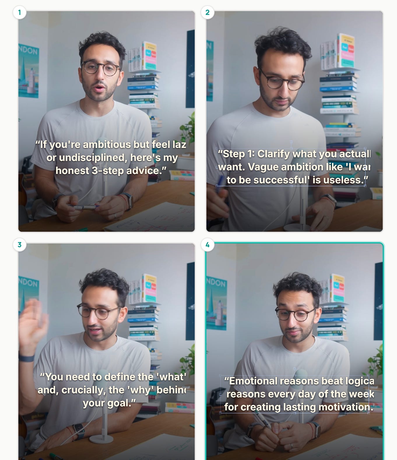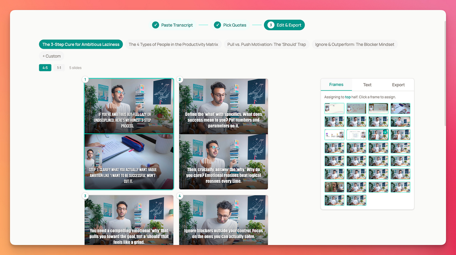 One of the most straightforward ways to repurpose a YouTube video is to make quote carousels. You’ve seen them: the split-screen ones where there’s a caption below a still video frame. In theory, a tool should automate this. In reality, the Ali Abdaal content team has been screenshotting frames, uploading them to Canva, formatting them for Instagram, YouTube community tab, LinkedIn. Then picking the best quotes, rephrasing as necessary without losing context.